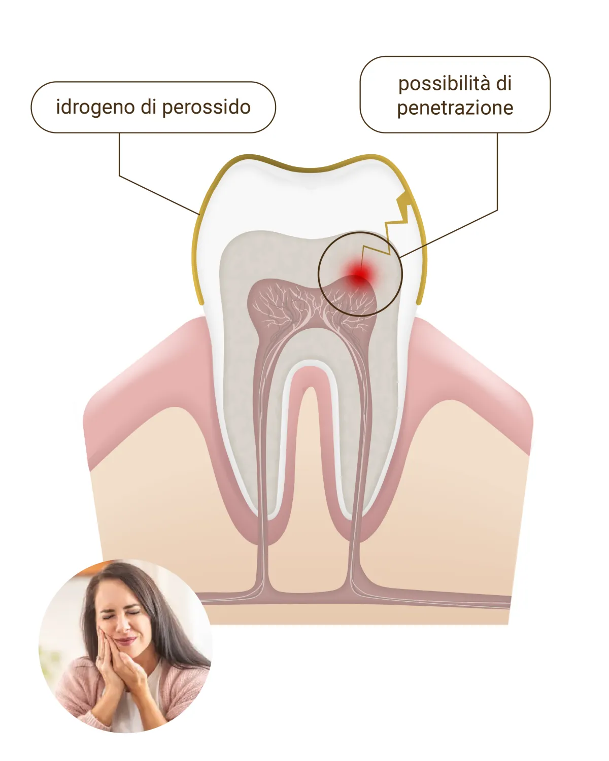 "Il perossido di idrogeno ad alte concentrazioni può causare demineralizzazione dello smalto, irritazione gengivale e ipersensibilità dentale che può durare giorni o settimane dopo il trattamento."
